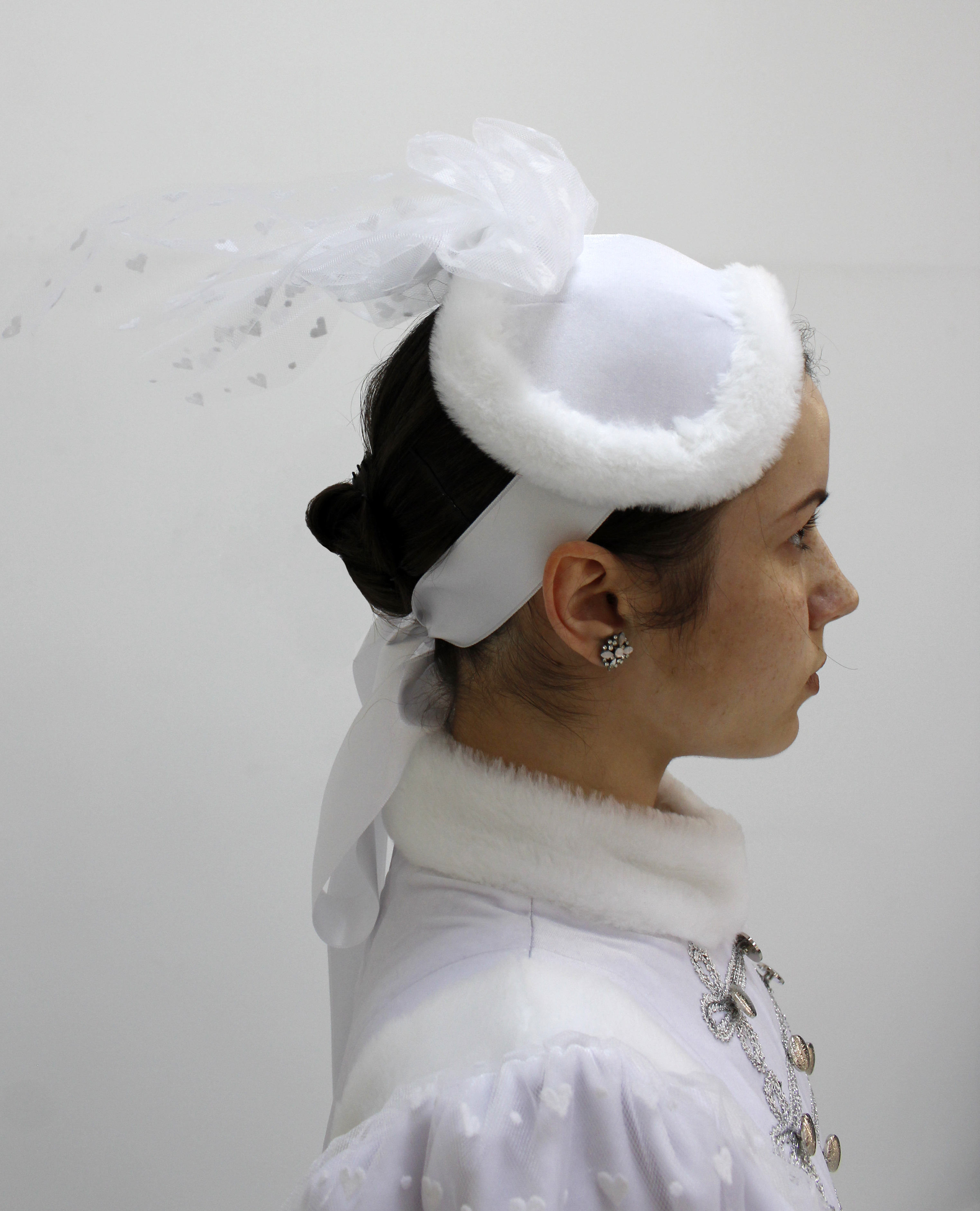 Beautiful bonnet is made of velvet and is decorated with white fur and small veil made of net with printed hearts. There is also satin braid attached so you could fix the headpiece.