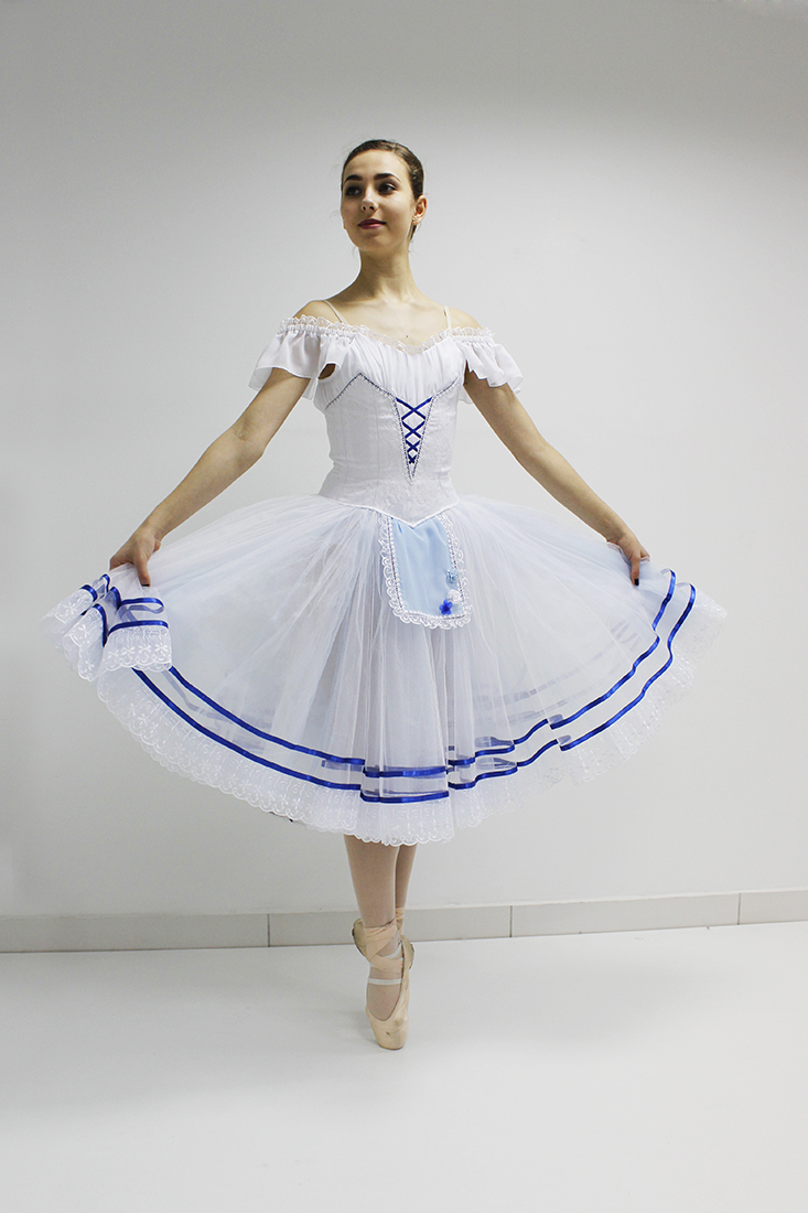 This costume perfectly fits for any peasant style variation in such ballets as "Giselle", "Coppelia", "La Fille mal Gardee", "Napoli" and other.Â