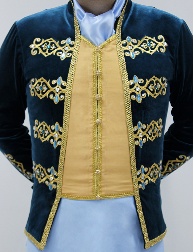 Professional ballet jacket is created of semi-stretched velvet, the imitation of vest is made of satin on the matte side. The imitation of vest is decorated with gold braid and buttons. The velvet part of the jacket is decorated with gold appliques, gold braid and beautiful crystals of different color and size.