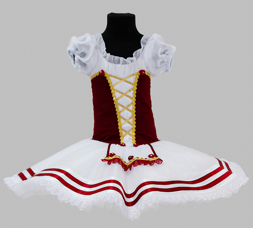 The overlay of the tutu is embellished with two satin ribbons. Costume is made in peasant style with a small apron in front. Apron decorated with small flowers, lace and gold braid.