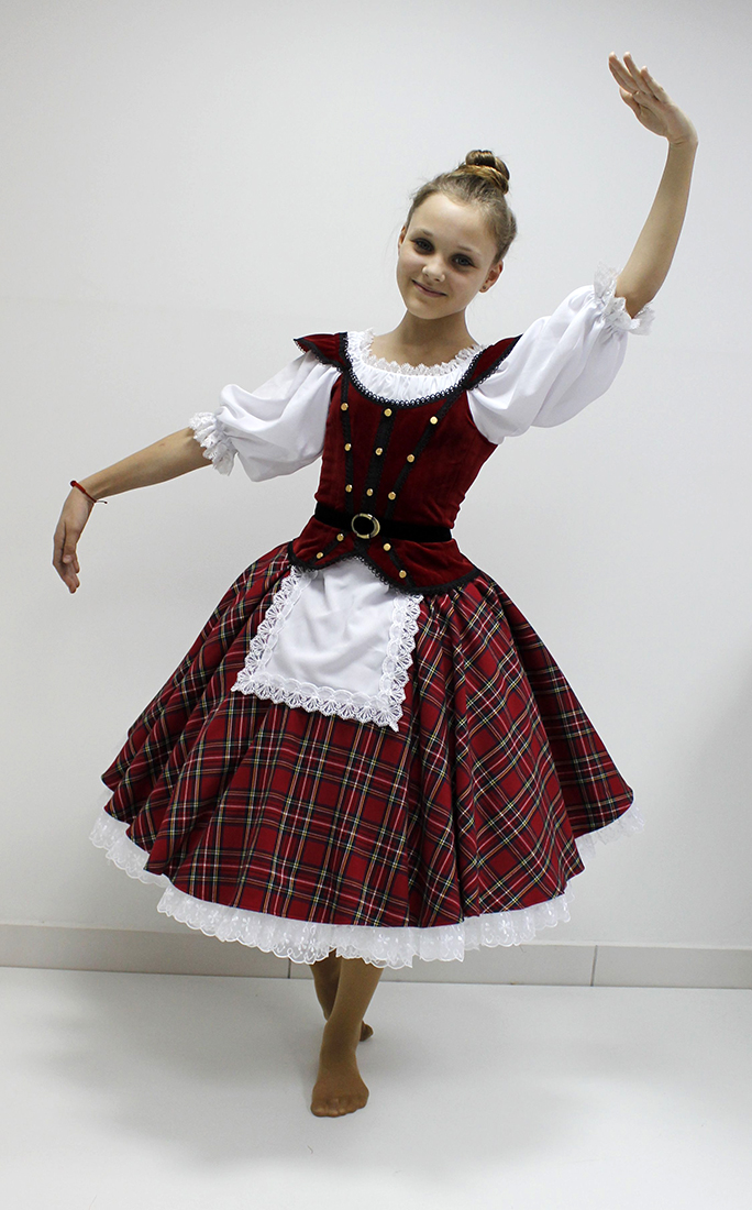 The costume is made in Scottish traditions. The bodice is carried out in the form of a velvet vest and a light crepe-chiffon blouse. The collar, the cuffs and the apron are trimmed with lace. Bodice goes separate from the skirt. Bodice is decorated with black braid, buttons and the imitation of belt.Â