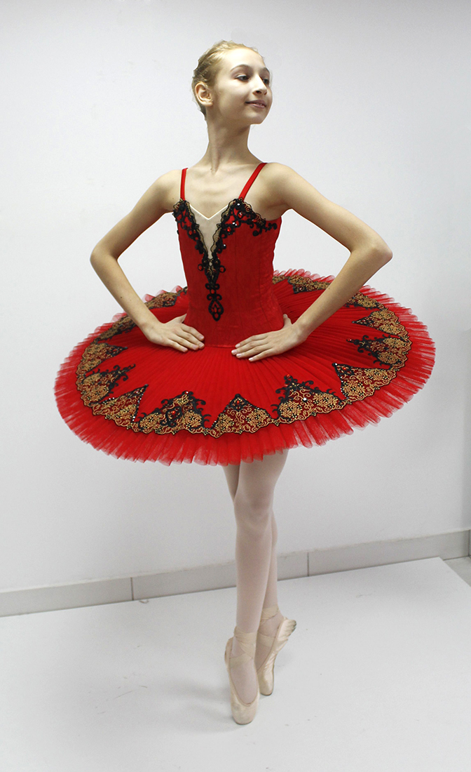 The overlay of the tutu is made of tulle and edged with black and gold lace. Costume is beautifully decorated with black appliques covered with black sequins, red and black crystals.