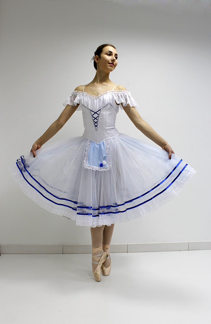 This costume perfectly fits for any peasant style variation in such ballets as "Giselle", "Coppelia", "La Fille mal Gardee", "Napoli" and other.Â