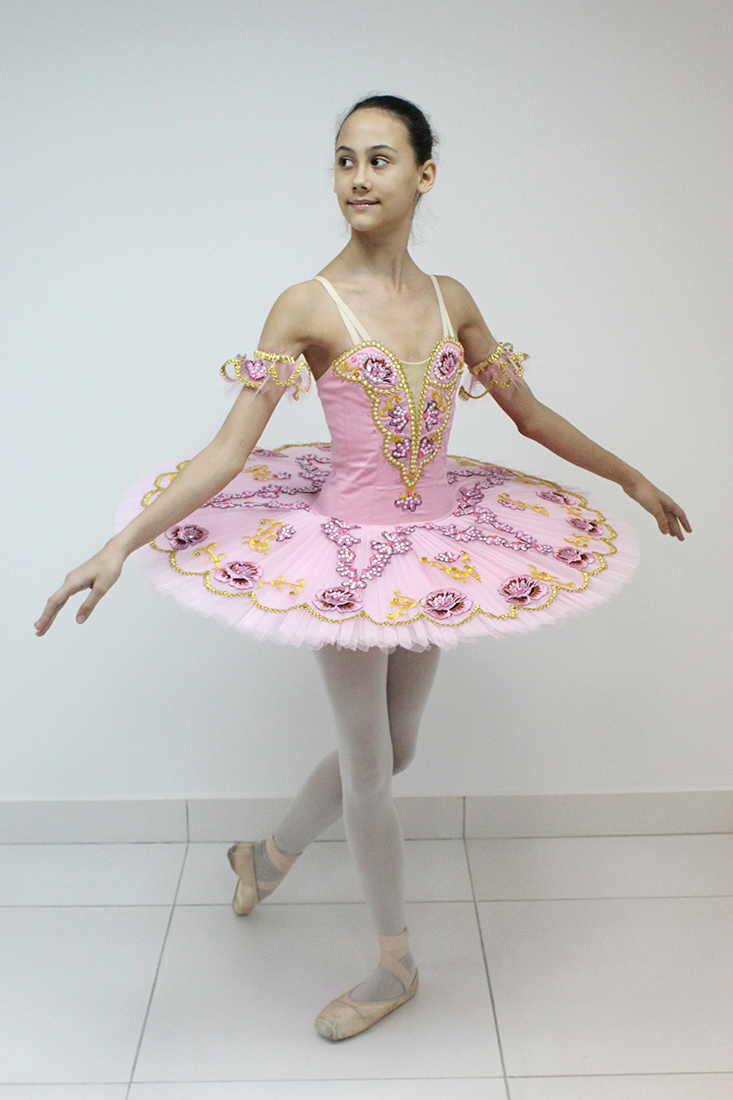 The magnificent embroidery on the bodice and overlay of the tutu is carried out in gold and light pink colors. The decor elements, such as appliques, sparkles, and crystals – highlight the costume’s exquisite aspect.Â