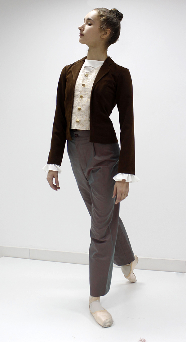 Professional ballet jacket is created of semi-stretched fabric, the imitation of vest is made of brocade and is decorated with gold buttons, the imitation shirt is made of milky chiffon. The trousers are made of taffeta.