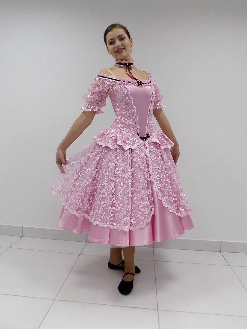 The bodice on the elastic flesh-colored straps is made of the semi-stretched fabric doubled with gentle lace fabric. The bodice has a deep satin inset on the chest. There are two rows of hooks on the bodice for the comfortable adjustment at the chest level. The overlay of the skirt and sleeves are made of the lace fabric. The skirt has six layers of tulle and the top layer is sewn of light satin. Costume is decorated with velvet braid, sequins and pearls.