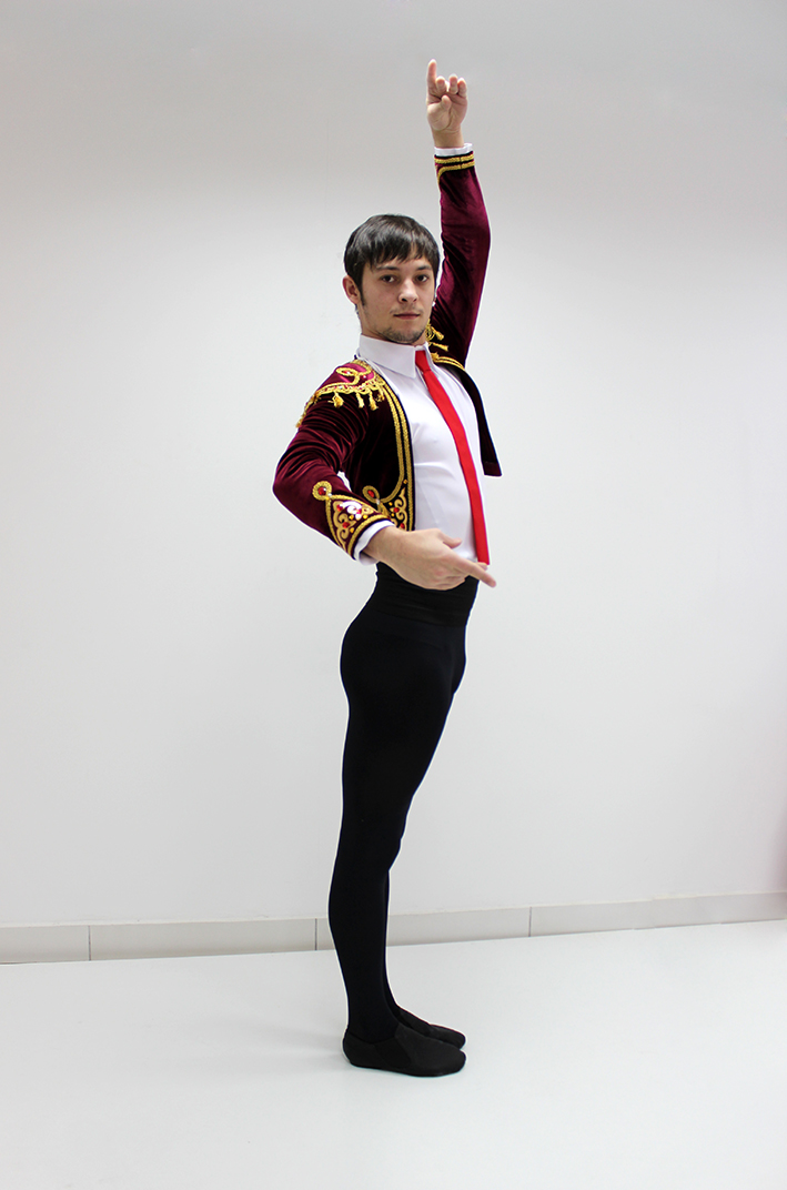 It is a professional stage costume, which is made of dense stretch velvet on a lining and has a short silhouette in the Spanish style traditions.