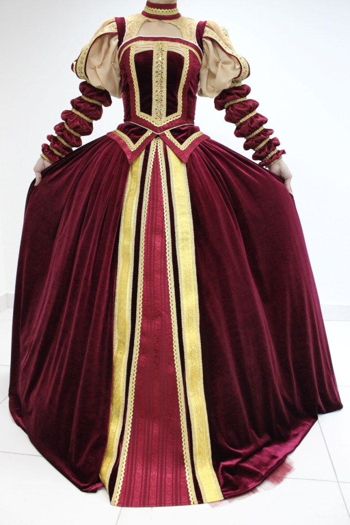 This gorgeous costume is made of separate bodice and skirt. The bodice is made of velvet in combination with viscose silk and lace fabric. The bodice has two rows of hooks for the comfortable regulation. The skirt has four layers. The top layer is made of velvet and has viscose silk insert in front. Then go three layers of soft tulle and crinoline skirt.  The skirt goes without panties. Costume is richly decorated with pearls and gold trim of different width and texture.