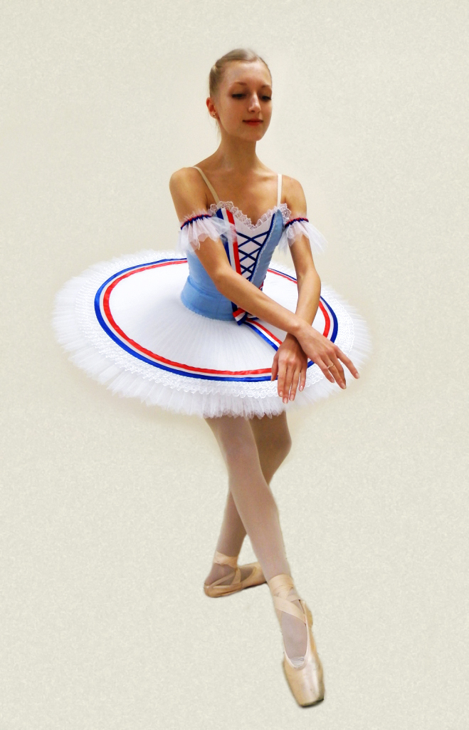 The costume’s style – highlighted with the help of three-colored tape, which symbolizes the French flag – is characteristic for the “Flame of Paris†ballet.