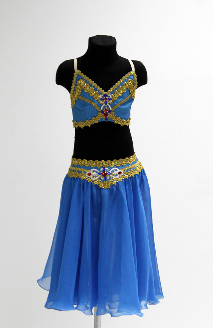 This stunning ballet costume is carried out in most exquisite oriental traditions. The bodice is short-cut and it is carried out apart from the skirt which should be worn on hips. The bodice as well as the belt of the skirt is made of the semi-stretched fabric. The skirt is made of two layers of light shiffon.Â