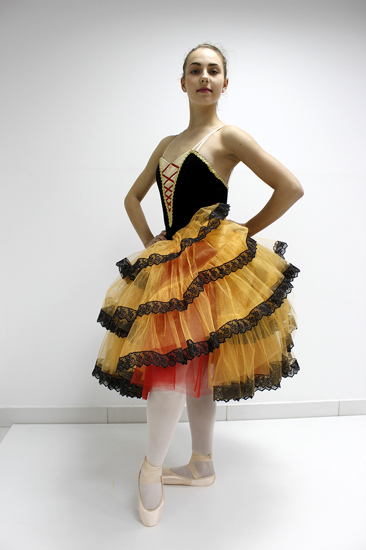 This ballet costume suits perfectly for the role "Kitri" scene “Tavern†in the “Don Quixote†ballet and can be used in other Spanish style variations.