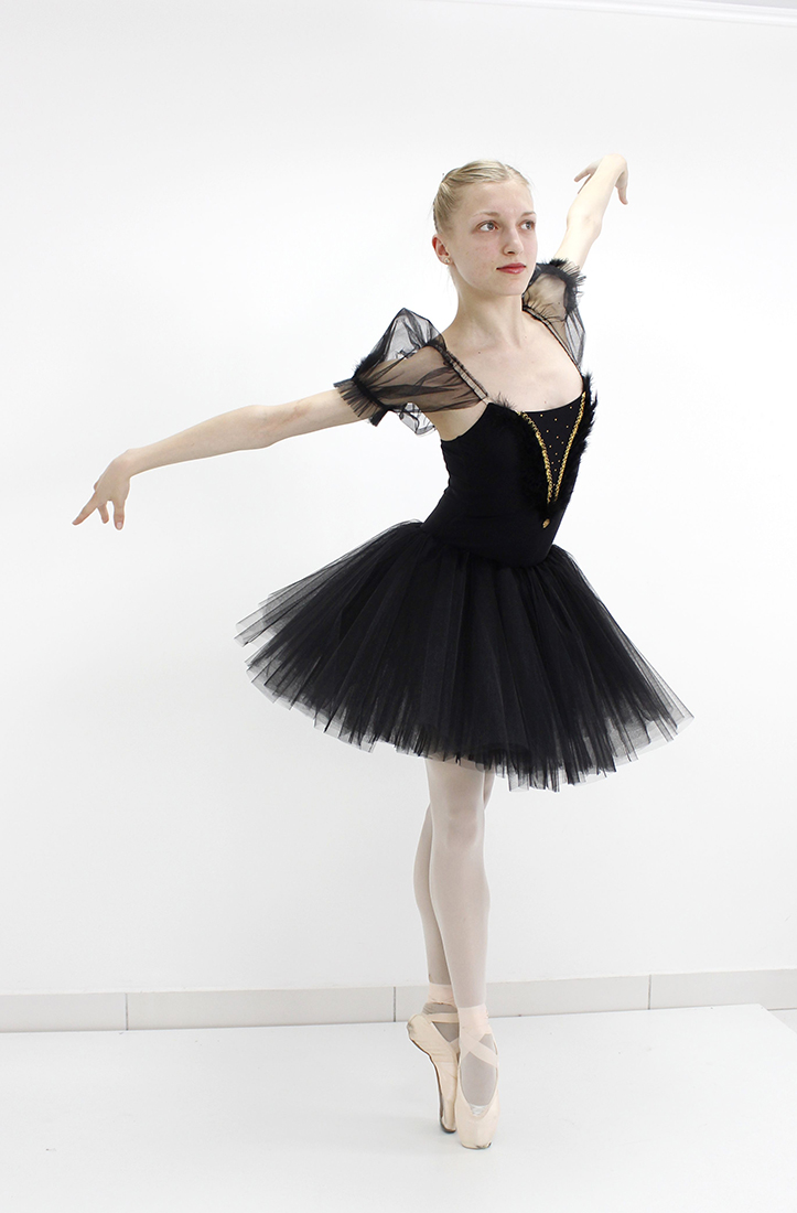 This beautiful costume for the role of a Black Swan is made on the basis of leotard and the romantic tutu attached to it. The skirt is made of three layers of soft tulle. Leotard is made of supplex with puffed sleeves made of soft tulle.Â