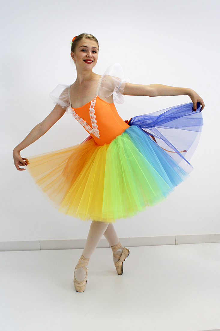 Costume is based on the camisole leotard. Romantic skirt is made of 3 layers of soft tulle and is attached to the leotard. Segments of the upper layer of the skirt repeat the colors of the rainbow (red, orange, yellow, green, blue, indigo, violet). Costume is decorated with lace on the chest and has a decorative bow on the back.Â