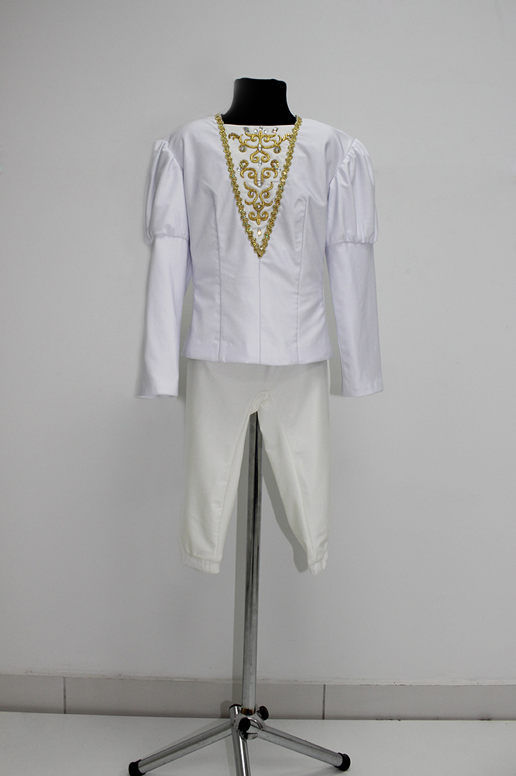 It is a professional stage costume, which is made of the stretch supplex fabric. There is ivory insert on the chest that is edged with gold braid and is richly decorated with appliques, crystals of different size and form, sequins and beads. Pants are made of supplex in the color of the insert on the bodice.Â