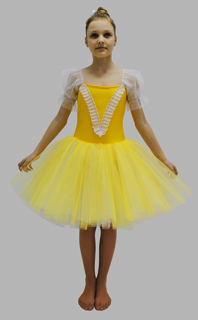 Costume is based on the camisole leotard. Romantic skirt is made of 3 layers of soft tulle and is attached to the leotard. Upper and lower layer are made of the soft tulle in the color of leotard, middle layer is made of white soft tulle.