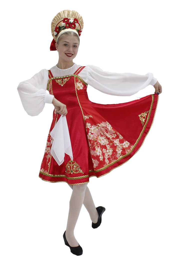 Sarafan is created of satin in best traditions of the Russian culture. It is decorated with braid, gold appliques, pearls and crystals.Â